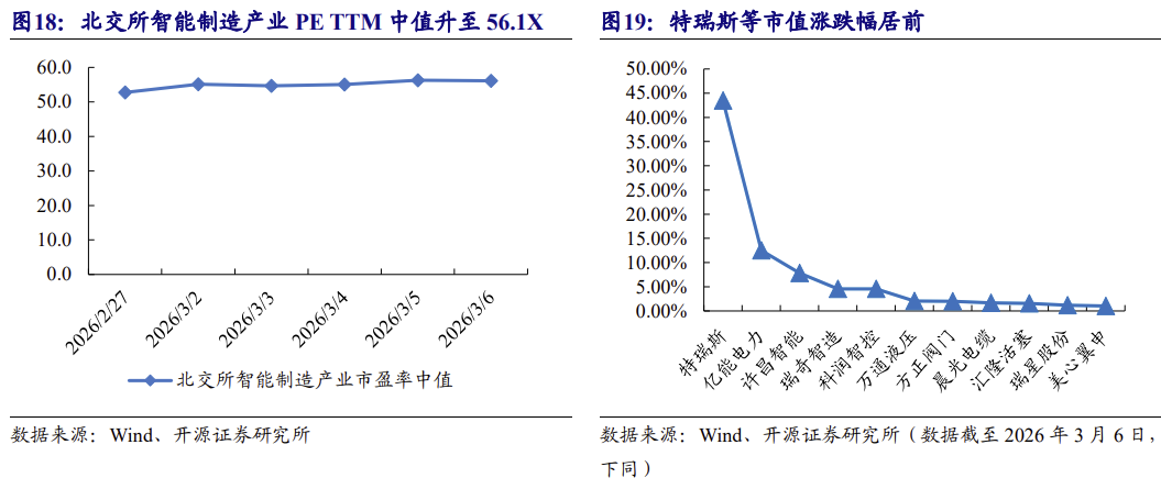 本周,从估值表现看,北交所智能制造产业市盈率 TTM 中值升至 56.1X。从本 周个股市值表现来看,特瑞斯+43.47%、亿能电力+12.49%、+7.85%分列市 值涨跌幅前三甲。(智能制造公司类别:包含机械设备、机械零件制造、军工制造、 交运设备、电气设备等细分行业)