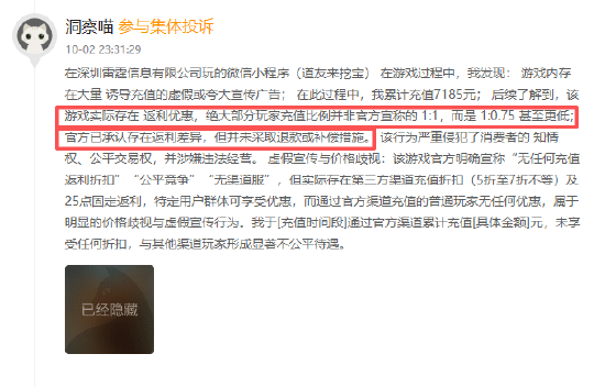 本年度黑猫投诉平台收到众多《道友来挖宝》玩家的集中反馈。玩家们指出,自己在游戏中进行充值,充值之前再三和客服确认是否存在返利现象,客服说没有优惠和折扣,再确认后才选择充值,现在却发现部分玩家有折扣和返利,而游戏未给玩家应有的补偿和回复,导致大量未获得返利的玩家不满,要求退款或赔偿。商家未对投诉做出回复。